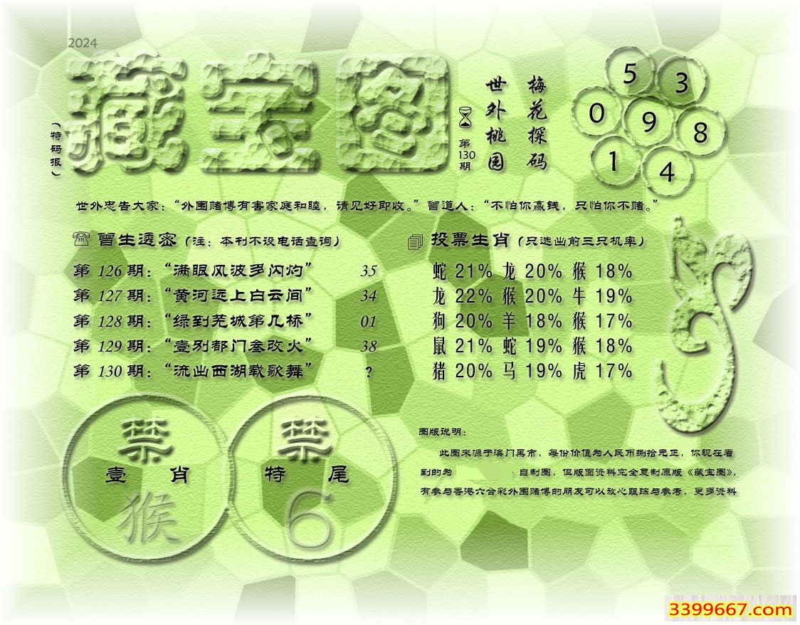 130期藏寶圖 新:道北轻风旆大开 老:流出西湖载歌舞 禁:猴 禁:6尾
