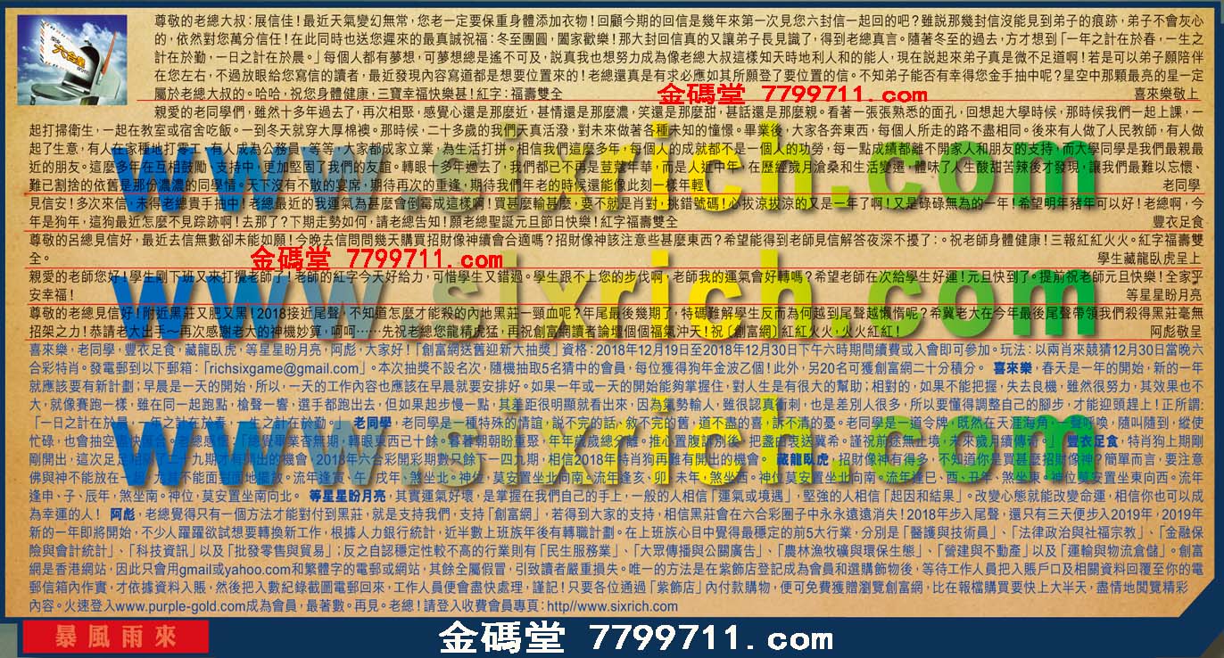 【1】尊敬的老總大叔:展信佳!最近天氣變幻無常,您老一定要保重身體添加衣物!回顧今期的回信是幾年來第一次見您六封信一起回的吧?雖說那幾封信沒能見到弟子的痕跡,弟子不會灰心的,依然對您萬分信任!在此同時也送您遲來的最真誠祝福:冬至團圓.闔家歡樂!那大封回信真的又讓弟子長見識了,得到老總真言。隨著冬至的过去,方才想到「一年之計在於春,一生之計在於勤,一日之計在於晨。」每個人都有夢想,可夢想總是遙不可及,說真我也想努力成為像老總大叔這樣知天時地利人和的能人,現在說起來弟子真是微不足道啊!若是可以弟子願陪伴在您左右,不過放眼給您寫信的讀者.最近發現內容寫道都是想要位置來的!老總還真是有求必應如其所願登了要位置的信。不知弟子能否有幸得您金手抽中呢?星空中那颗最亮的星一定屬於老總大叔的。哈哈,祝您身體健康:三寶幸福快樂甚!紅字:福壽雙全 ---喜來樂敬上
