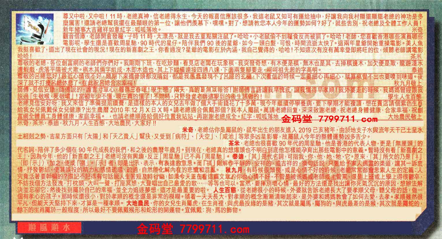 【1】尊又中啦,又中啦! 11時,老總真神,信老總得永生,今天的報喜信應該很多,我這老鼠又知可有運給抽中,好讓我向我村顯罷顯擺老總的神功是多麼厲害!還請老總幫我擺在最顯眼的第一位 ,讓他們羨慕下,嘿嘿。對了,想請教您本人今年的運勢如何?好了,就些告别,祝老總及全體工作人員!新年豬事大吉雞祥如意紅字:呱呱落地。 ---米奇