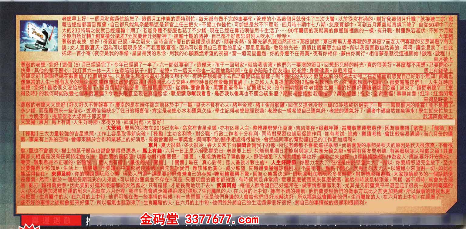 【1】老總早上好!一個月沒寫過信給您了,這個月工作真的是特別忙,每天都有做不完的事要忙管理的小區這個月就發生了三次火警.以前從沒有過的,刚好我這個月升職了就接連三宗,寫報告總結都寫到頭痛,自己都只能無奈戲稱這是新官上任三把火。不過工作雖忙可卻總是放不下買彩,四月時十期中七八期,怎麼買都中,可到五月運氣就直線下降了,自從50期中了次大的230特碼之後就已經連輸十期了,老爸身體不舒服也花了不少錢,現在已經在靠花唄信用卡生活了……90年屬馬的我就真的像通勝裡說的一樣,有升職、財運跌宕起伏,不知六月能不能有所好轉?創富積分還差7分就要晉升到赌神了:建翰十期的睹神自己都不好意思跟別人吹水了,哈哈。 ---大笨豬