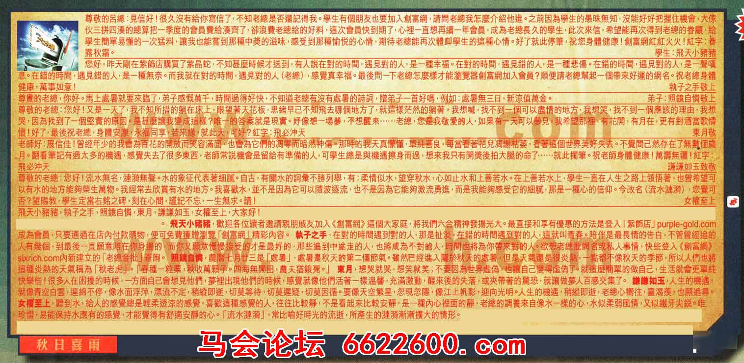 【1】尊敬的呂總:見信好!很久沒有給你寫信了,不知老總是否還記得我。學生有個朋友也要加入創富網,請問老總我怎麼介紹他進。之前因為學生的愚昧無知,沒能好好把握住機會,大傢伙三拼四凑的總算把一季度的會員費給湊齊了,卻浪费老總給的好料,這次會員快到期了,心裡一直想再續一年會員,成為老總長久的學生,此次來信,希望能再次得到老總的眷顧,給學生簡單易懂的一次猛料,讓我也能嘗到那種中獎的滋味,感受到那種愉悦的心情,期待老總能再次體卸學生的這種心情。好了就此停筆,祝您身體健康!創富網紅紅火火!紅字:春露秋霜。--- 學生:飛天小豬豬