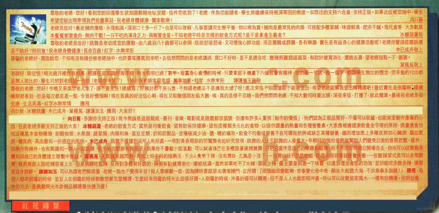 【6】尊敬的老總:您好!今晚又來煩您老人家了,請不要見怪!連續寫了好幾封都不見刊登,不知道老總是不是嫌我太煩了呀!這次來信不知道還能不能被登出,希望老總能幫我登出轉轉運吧!最近實在是倒霉啊,連續幾期都看到,但是每次都是差一點,令我好懊惱啊!現在我真的好沒信心啊,現在又和幾個朋友追大數,唉,真的是惨不忍睹。我們想問問老總,不知大數何時要出頭,深夜來信,打擾了,就此擱筆。最後祝老總幸福安康,生活美滿。紅字水無常情---騰飛