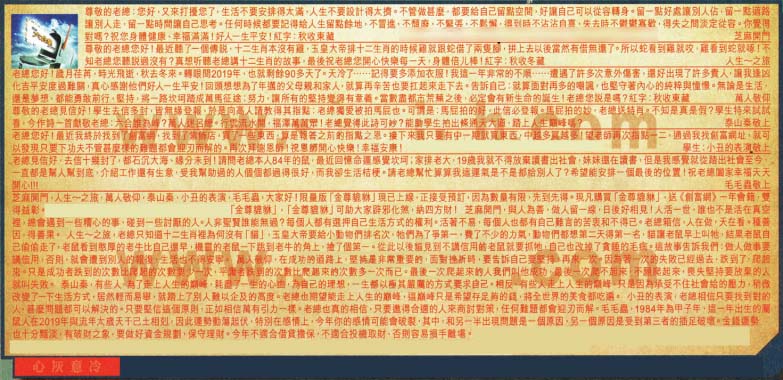【3】老總您好!崴月荏苒,時光飛逝,秋去冬來。轉眼間2019年,也就剩餘90多天了。天冷了...記得要多添加衣服!我這一年非常的不順...遭遇了許多次意外傷害,還好出現了許多貴人,讓我逢凶化吉平安度過難關,真心感謝他們好人一生平安!回頭想想為了年邁的父母親和家人,就算再辛苦也要扛起來走下去。告訴自己:就算面對再多的嘲諷,也堅守著内心的純粹與憧憬。無諭是生活,還是夢想,都能勇敢前行,堅持,將一路坎坷踏成萬馬征途;努力,讓所有的堅持變得有意義。當數盡都市荒蕪之後,必定會有新生命的誕生!老總您說是嗎?紅字:秋收東藏-----萬人敬仰