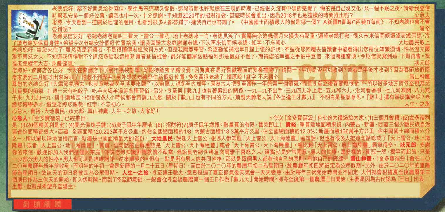 【4】.老總您好,給您來信了,雖然我是新讀者,不是很懂得老總放料方式,但是我願意學習,希望勤能補拙早日趕上您的步伐。不過從您回覆去信讀者中能看得出您是位知識淵博、性格溫文爾雅不喜怒之人,不知道我猜得對不?請您多給我這種新讀者登信機會,最好能簡單送點福利那是最好不過了,期待您的幸運之手抽中登信,來個鴻運當頭。今期信就寫到這,下期再會。祝福老總豬年大吉,身體健康。    狀元郎