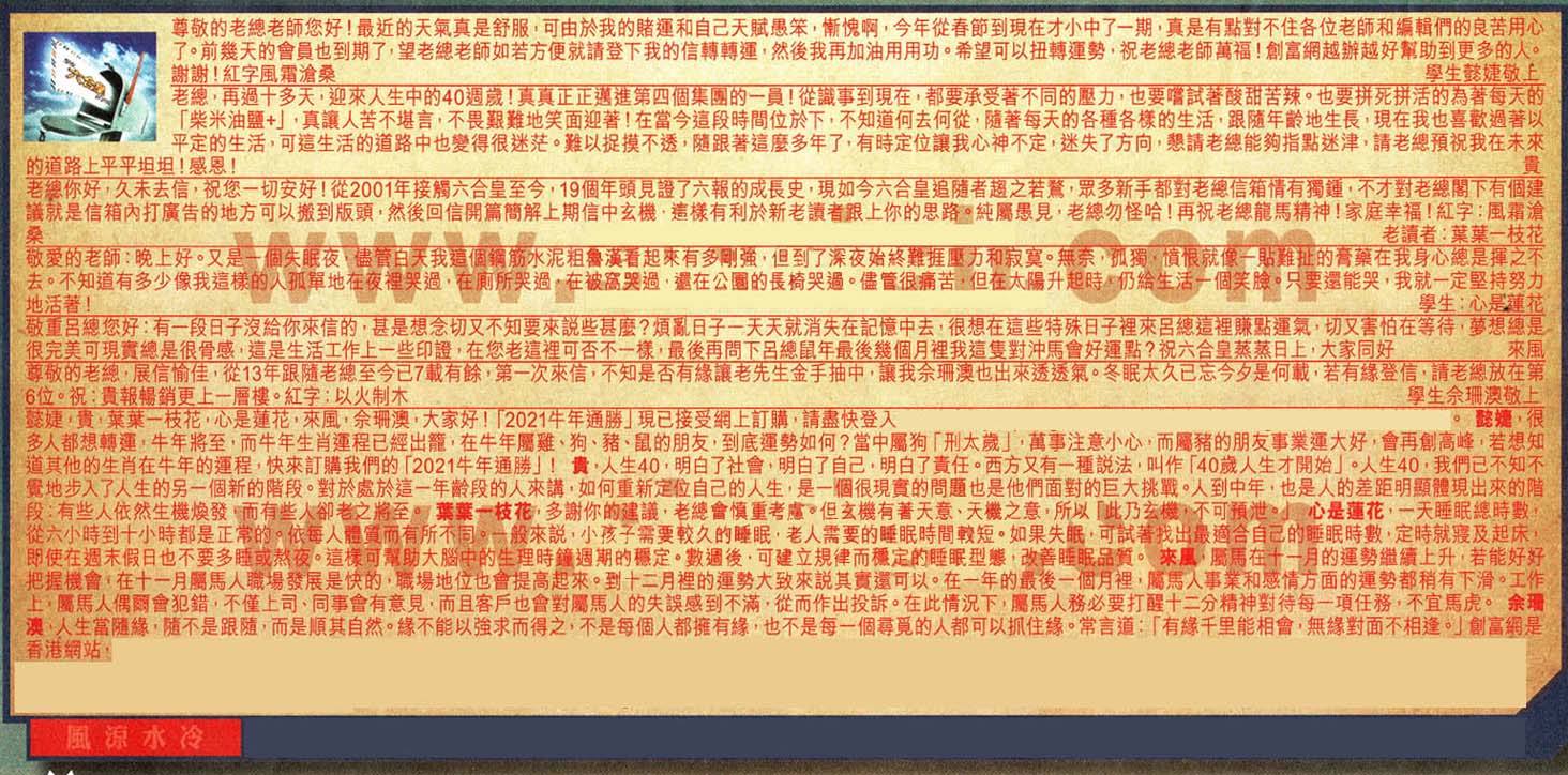 【3】.老總你好!久未去信,祝你一切安好!從2001年接觸六合皇至今,19個年頭見證了六報的成長史,現如今六合皇追隨者趨之若鶩,眾多新手都對老總信箱情有獨鐘,不才對老總閣下有個建議就是信箱內打廣告的地方可以搬到版頭,然後回信開篇簡解上期信中玄機,這樣有利於老讀者跟上你的思路。純屬愚見,老總勿怪哈!再祝老總龍馬精神!家庭幸福!紅字:風霜滄桑 老讀者:葉葉一枝花