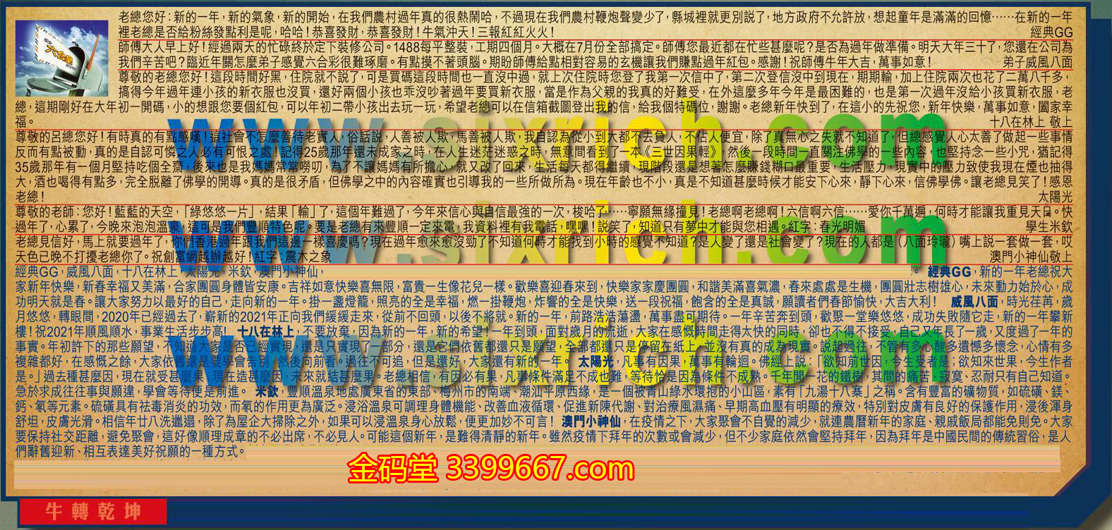 【6】.老總見信好,馬上就要過年了,你們香港過年跟我們這邊一樣喜慶嗎?現在過年愈來愈沒勁了不知道何時才能找到小時的感覺不知道?是人變了還是社會變了?現在的人都是(八面玲瓏)嘴上說一套做一套,哎天色已晚不打擾老總你了。祝創富網越辦越好!紅字:震木之象  澳門小神仙敬上