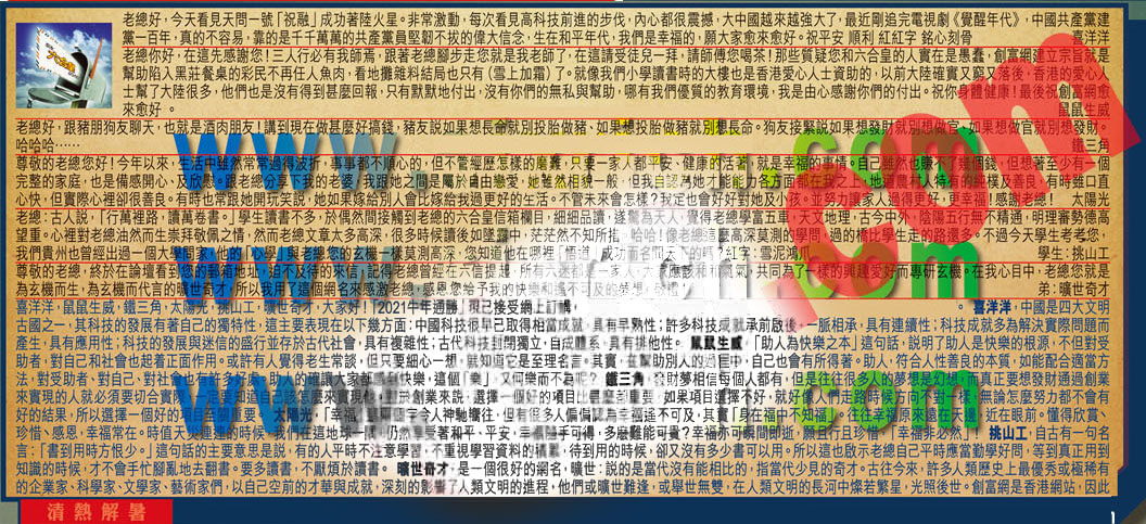 【1】.老總好,今天看見天問一號「祝融」成功著陸火星。非常激動,每次看見高科技前進的步伐,內心都很震撼,大中國越來越強大了,最近剛追完電視劇《覺醒年代》,中國共產黨建黨一百年,真的不容易,靠的是千千萬萬的共產黨員堅韌不拔的偉大信念,生在和平年代,我們是幸福的,願大家愈來愈好。祝平安 順利 紅紅字 銘心刻骨    喜洋洋