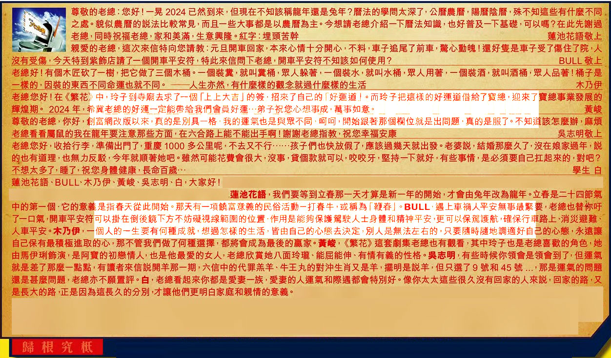 【5】.尊敬的老總,你好,創富網改版以來,真的是別具一格,我的運氣也是與眾不同,啊呵,開始跟著那個欄位就是出問題,真的是服了。不知道該怎麼辦,麻煩老總看看屬鼠的我在龍年要注意那些方面,在六合路上能不能出手啊!謝謝老總指教,祝您幸福安康 吳志明