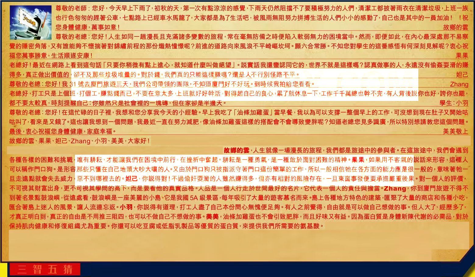 【5】.老總好,打工只是上個班,打個工,賺點錢而已,不要在意太多,上班就好好幹活,對得起自己的良心,累了就休息一下,工作千千萬總也幹不完,有人背後說你也好,誇你也罷,都不要太較真,時刻提醒自己:你雖然只是社會裡的一塊磚,但在家卻是半邊天。 學生:小羽