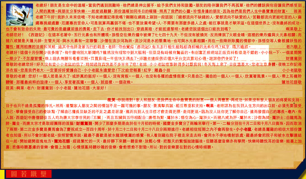 【3】.老師您好!《西遊記》:在這本名著中,五行元素也有所體現。孫悟空在煉丹爐中被煉了七七四十九天, 不但沒有被燒死,反而煉就了火眼金睛, 這裡的煉丹爐與火元素相關;而猪八戒曾是天蓬元帥,主管天河,與水元素有一定聯繫;沙僧在流沙河為妖,流沙河是水的聚集地,也可與水元素相關。而在一些降妖除魔的情節中,孫悟空等人會根據妖怪的屬性,運用相應的法術和策略,這其中也隱含著五行的觀念。老師!你也覺得《西遊記》有五五行相生相克相濟相補的元素在嗎?紅字:鑽穴逾牆。 老六敬上