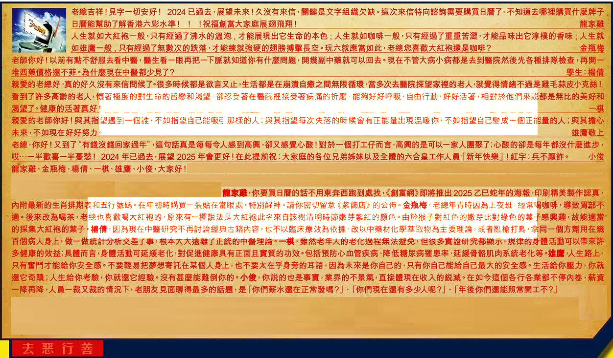 【6】.老總,你好!又到了“有錢沒錢回家過年”,這句話真是每每令人感到高興,卻又感覺心酸!對於一個打工仔而言,高興的是可以一家人團聚了;心酸的卻是每年都沒什麼進步,哎...一半歡喜一半憂愁!2024 年已過去,展望2025年會更好!在此提前祝:大家庭的各位兄弟姊妹以及全體的六合皇工作人員「新年快樂」!紅字:兵不厭詐。 小俊