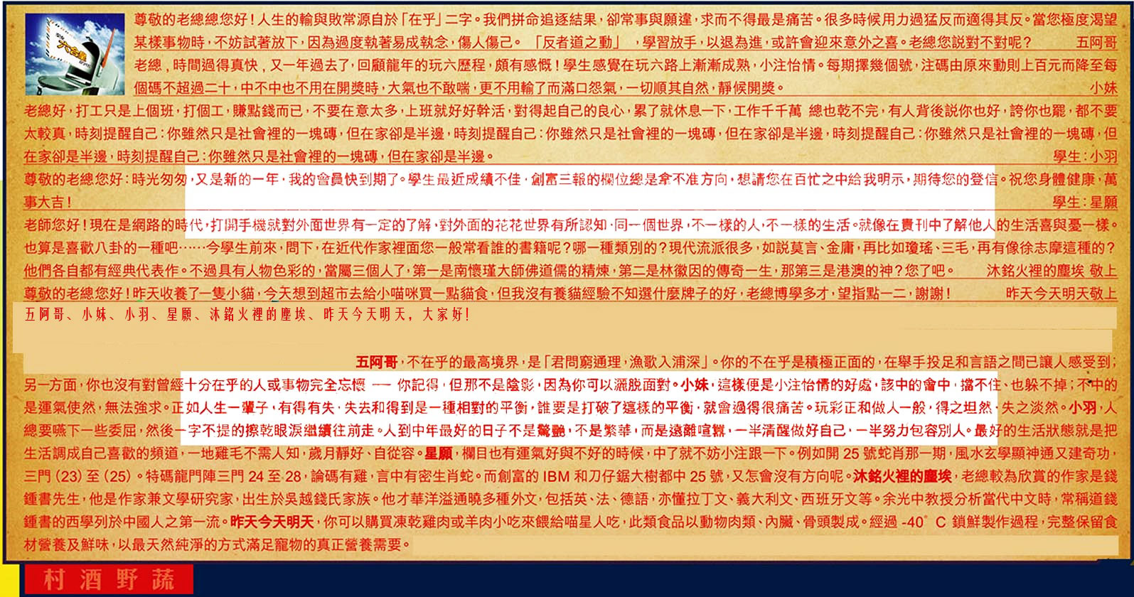 【4】.尊敬的老總您好:時光匆匆,又是新的一年.我的會員快到期了。學生最近成績不佳,創富三報的欄位總是拿不准方向,想請您在百忙之中給我明示,期待您的登信。祝您身體健康,萬事大吉! 學生:星願