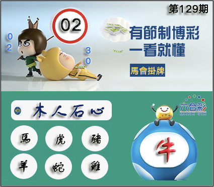 129期正版彩图挂:02 爆:牛 挂牌成语:木人石心 挂牌出肖:马虎猪羊蛇鸡