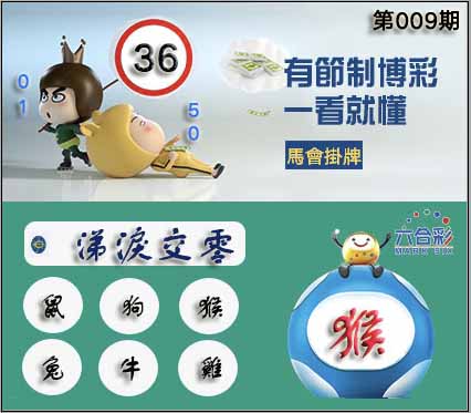 009期正版彩图挂:36 爆:猴 挂牌成语:涕泪交零 挂牌出肖:鼠狗猴兔牛鸡