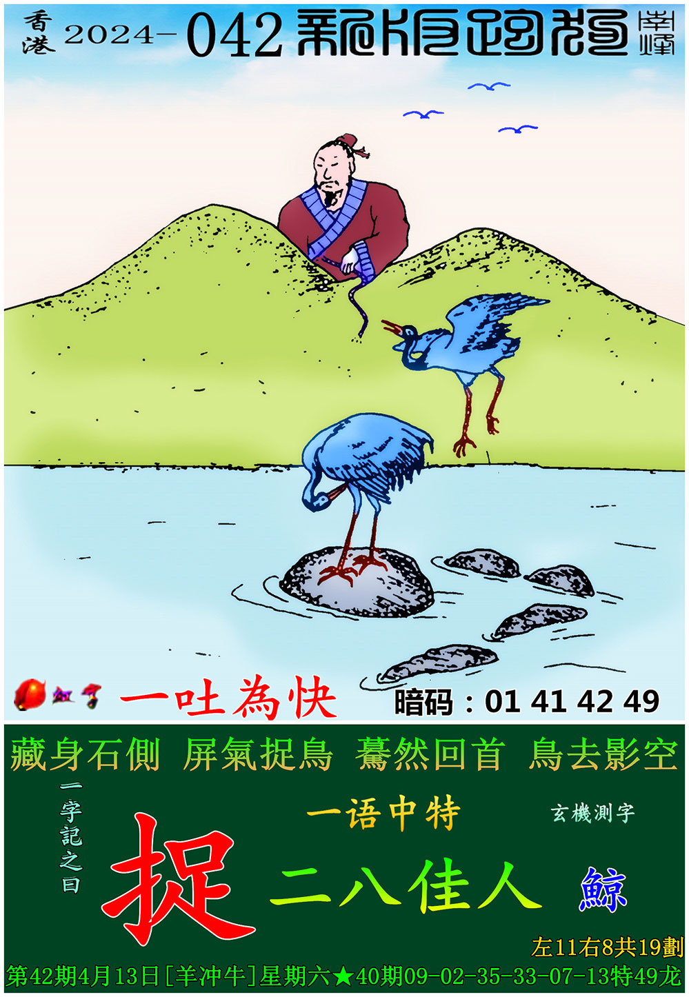 042期:新版跑狗一字記之曰【捉】 玄機測字:【鯨】