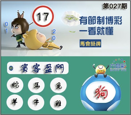 027期正版彩图挂:17 爆:狗 挂牌成语:宾客盈门 挂牌出肖:蛇马兔羊牛鸡